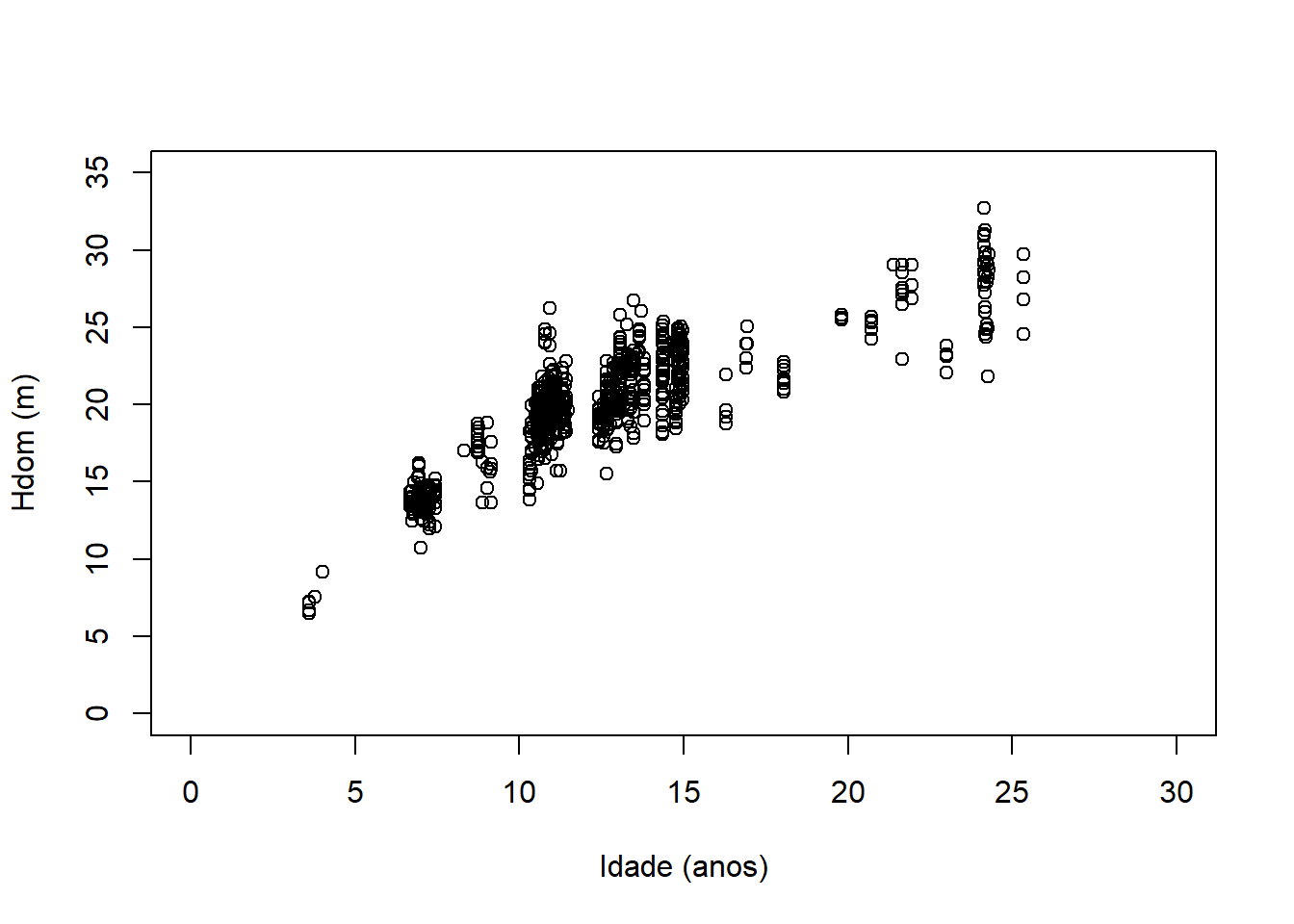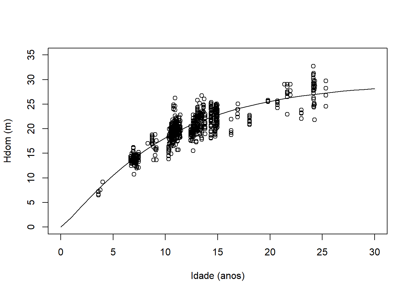 xlab = 'Idade (anos)', ylab = 'Hdom (m)')